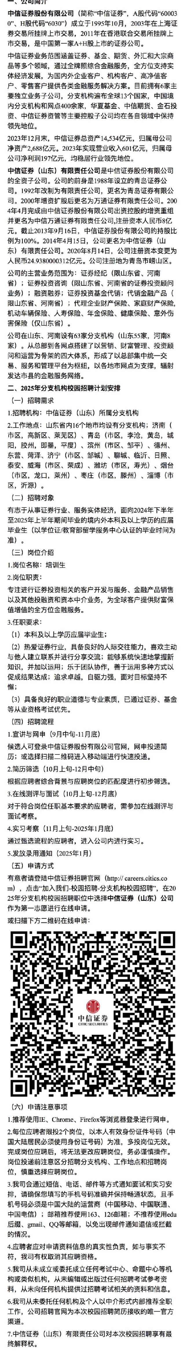 招聘 中信证券(山东)有限责任公司2025年校园招聘简章